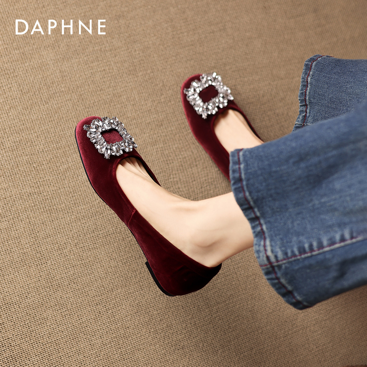 达芙妮酒红色浅口单鞋女2025年水钻矮跟不累脚平底法式婚鞋伴娘鞋
