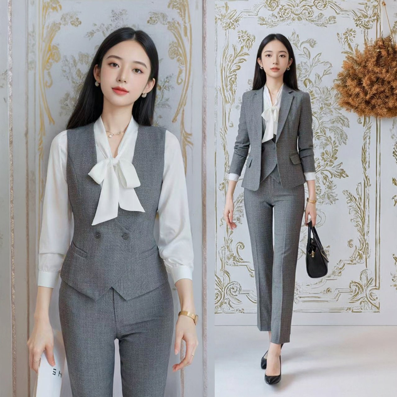 职业装女装马甲美容师套装三件套秋冬长袖西装酒店前台工作服套裤