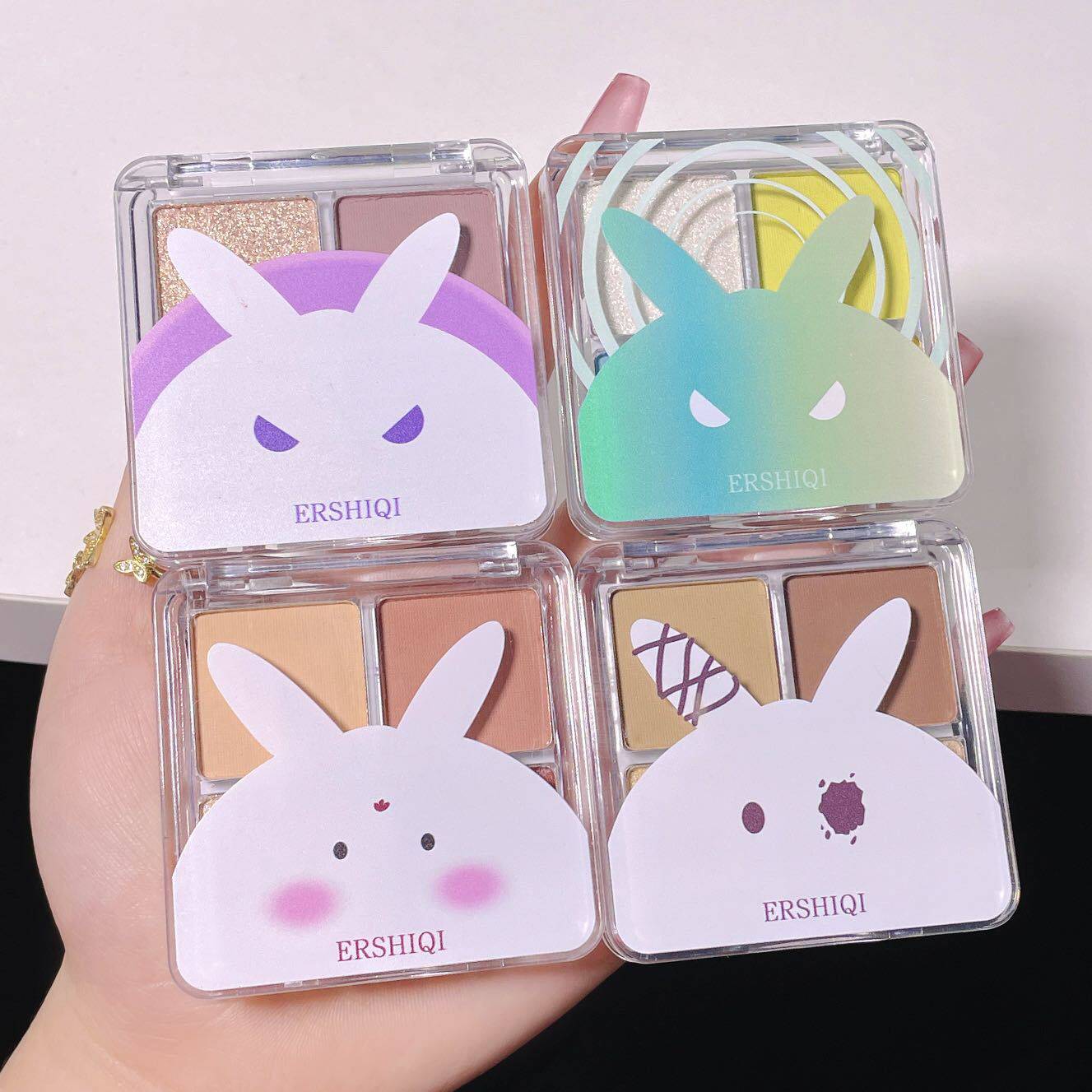 跨境专属ErshiQi自由兔子4色可爱眼影盘哑光细闪高光腮红显色少女