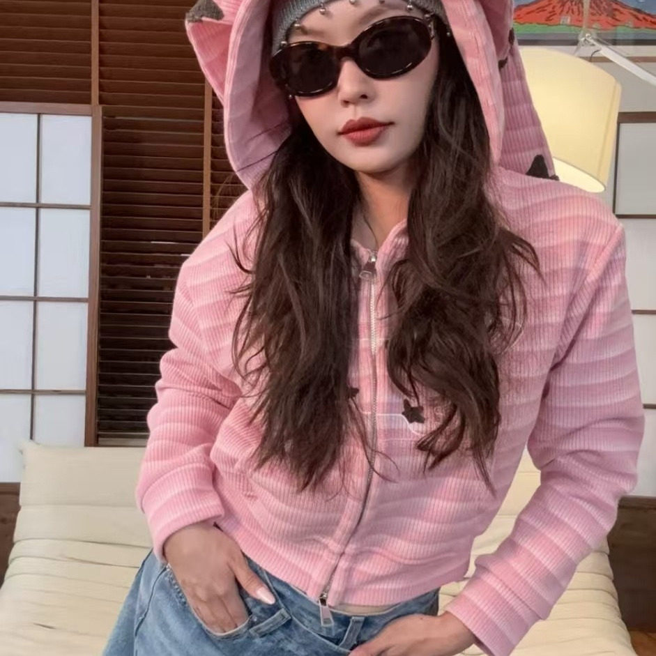 韩系粉色条纹兔耳朵连帽卫衣女春秋新款修身休闲学院风短款外套潮