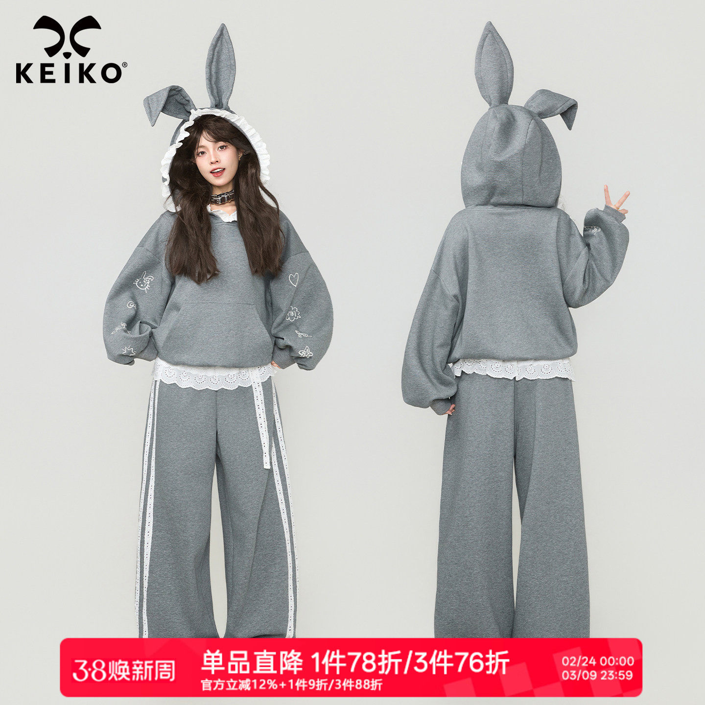 KEIKO 少女风蕾丝花边运动卫衣套装26春季兔耳朵连帽外套+休闲裤