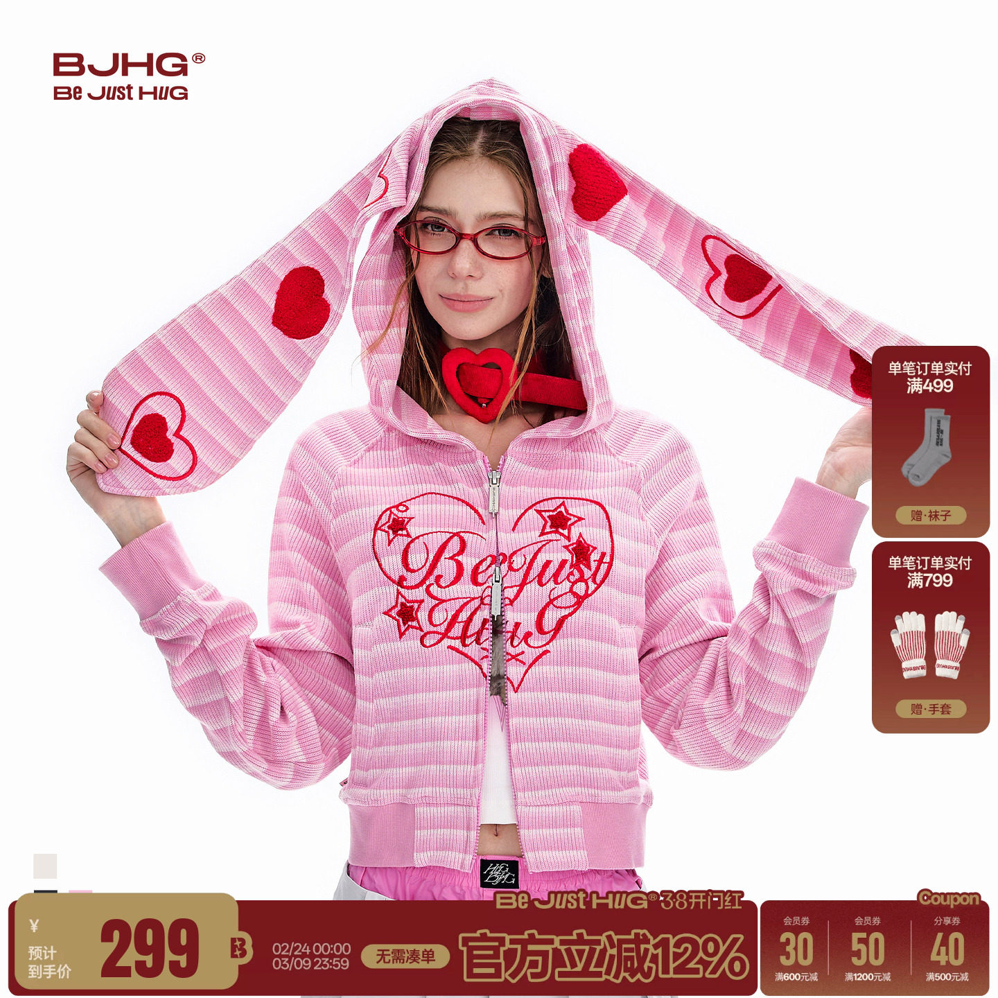 BJHG不计后果萌趣兔耳朵连帽卫衣女春季潮牌复古撞色条纹短款外套
