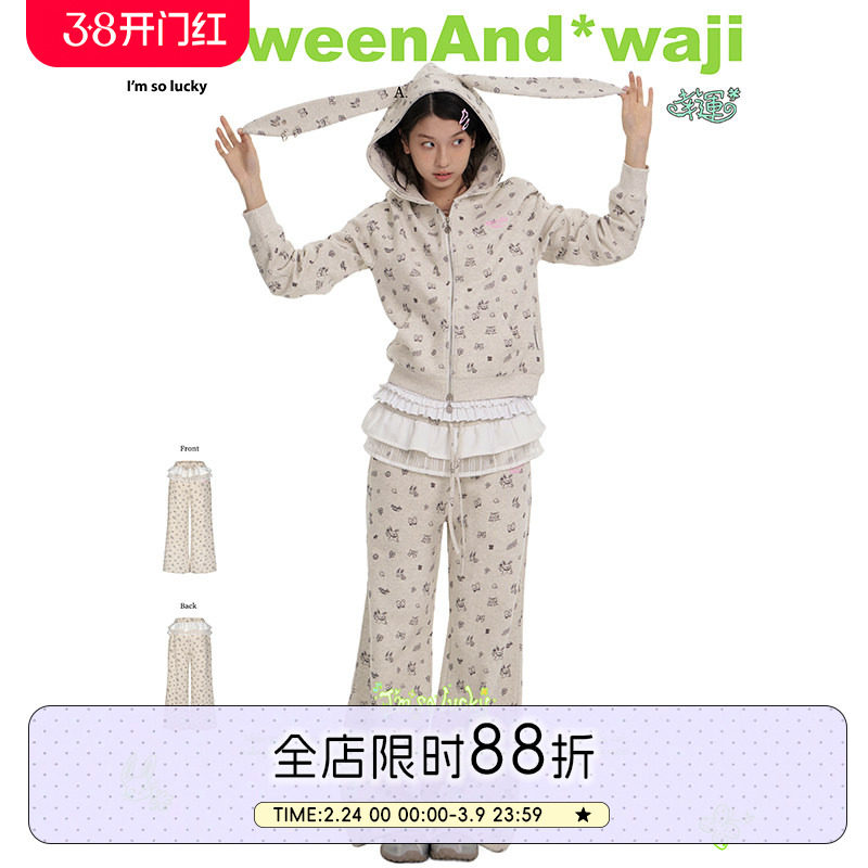BETWEENAND春季2026新款waji满印兔耳朵连帽卫衣微喇卫裤套装女