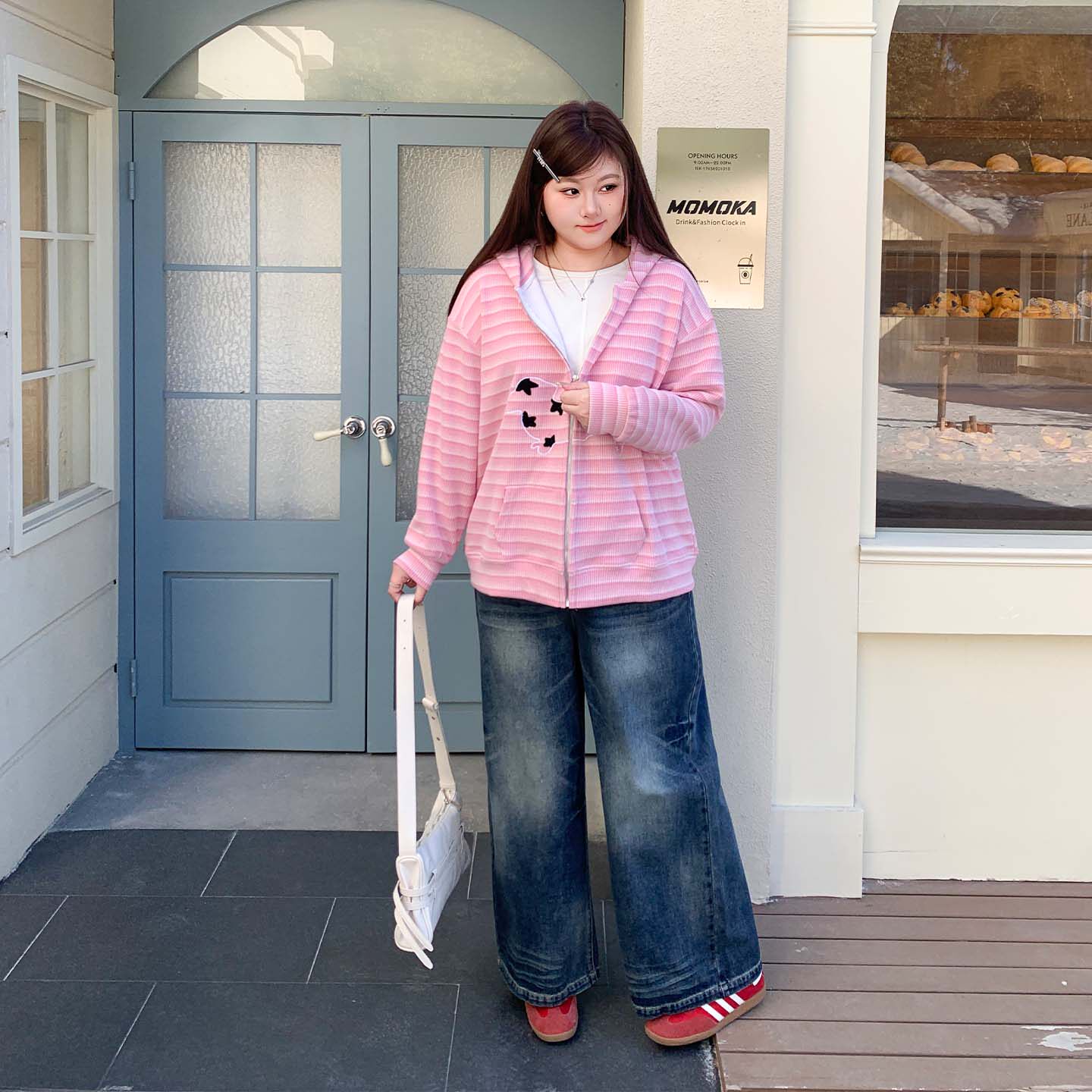 YUZI鱼子粉色条纹卫衣拉链连帽兔耳朵刺绣宽松落肩微胖大码女装