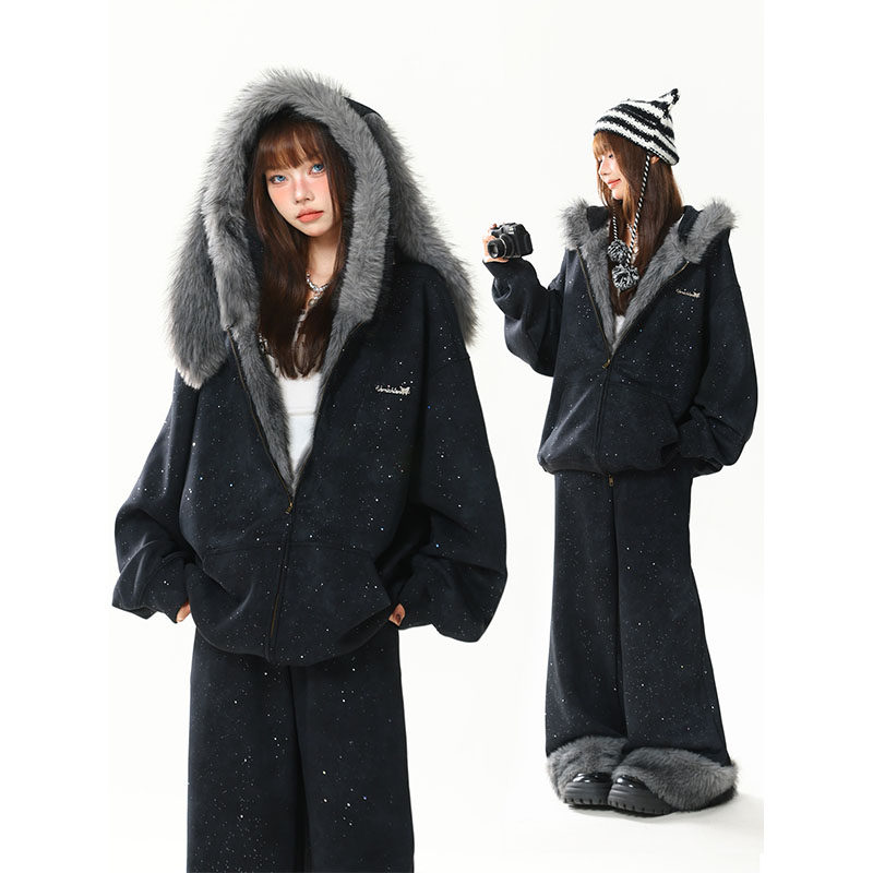 美式满天星毛领兔耳朵加绒连帽卫衣女秋冬季加厚宽松百搭外套潮牌