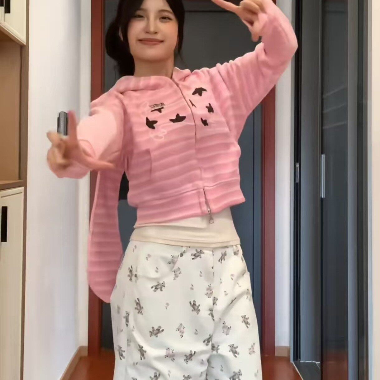 欢简韵美式绣花粉色条纹兔耳朵连帽卫衣女秋冬新款休闲学院风外套