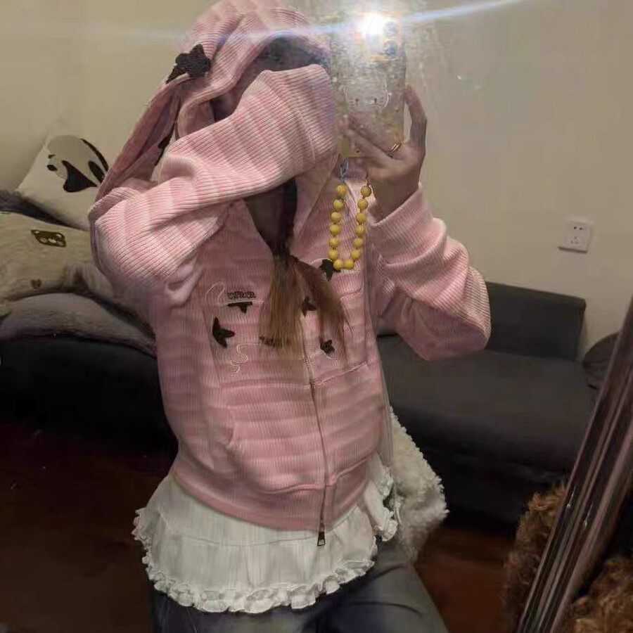NELY小尼力y2k小众兔子耳朵可爱条纹连帽卫衣女春秋休闲开衫外套