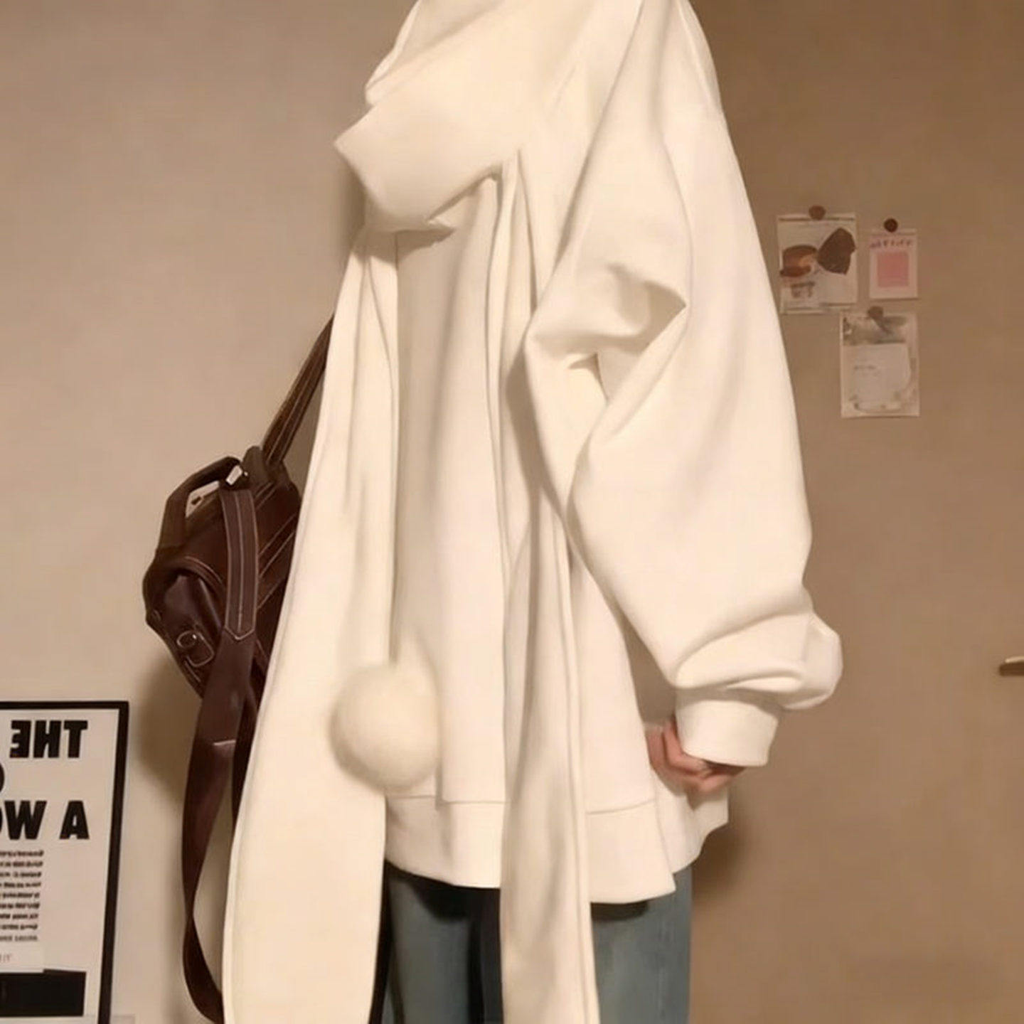 可爱兔耳朵白色连帽卫衣女春秋oversize薄款外套宽松慵懒开衫上衣