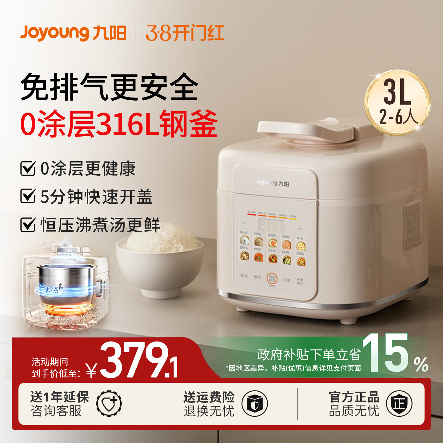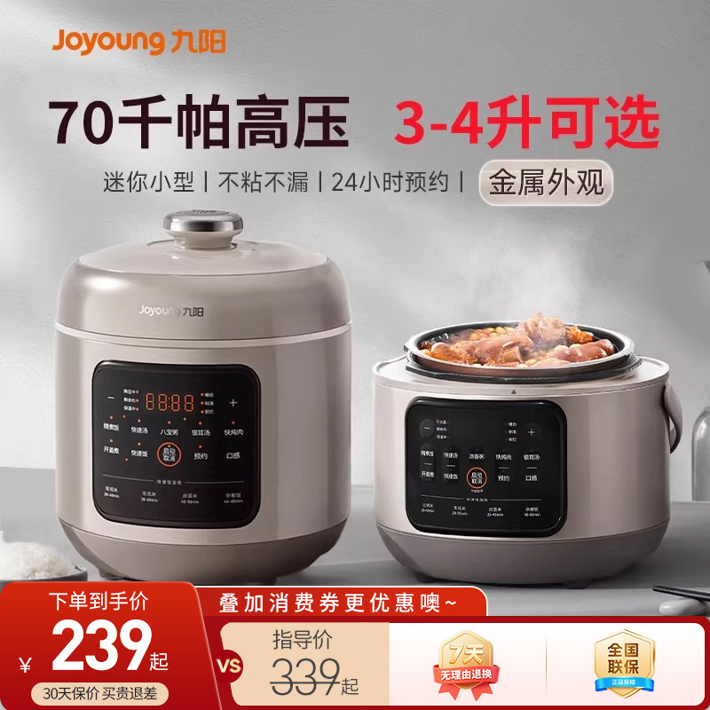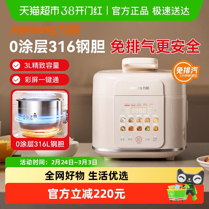 九阳电压力锅家用0涂层内胆3L小容量智能预约高压锅多功能电饭煲