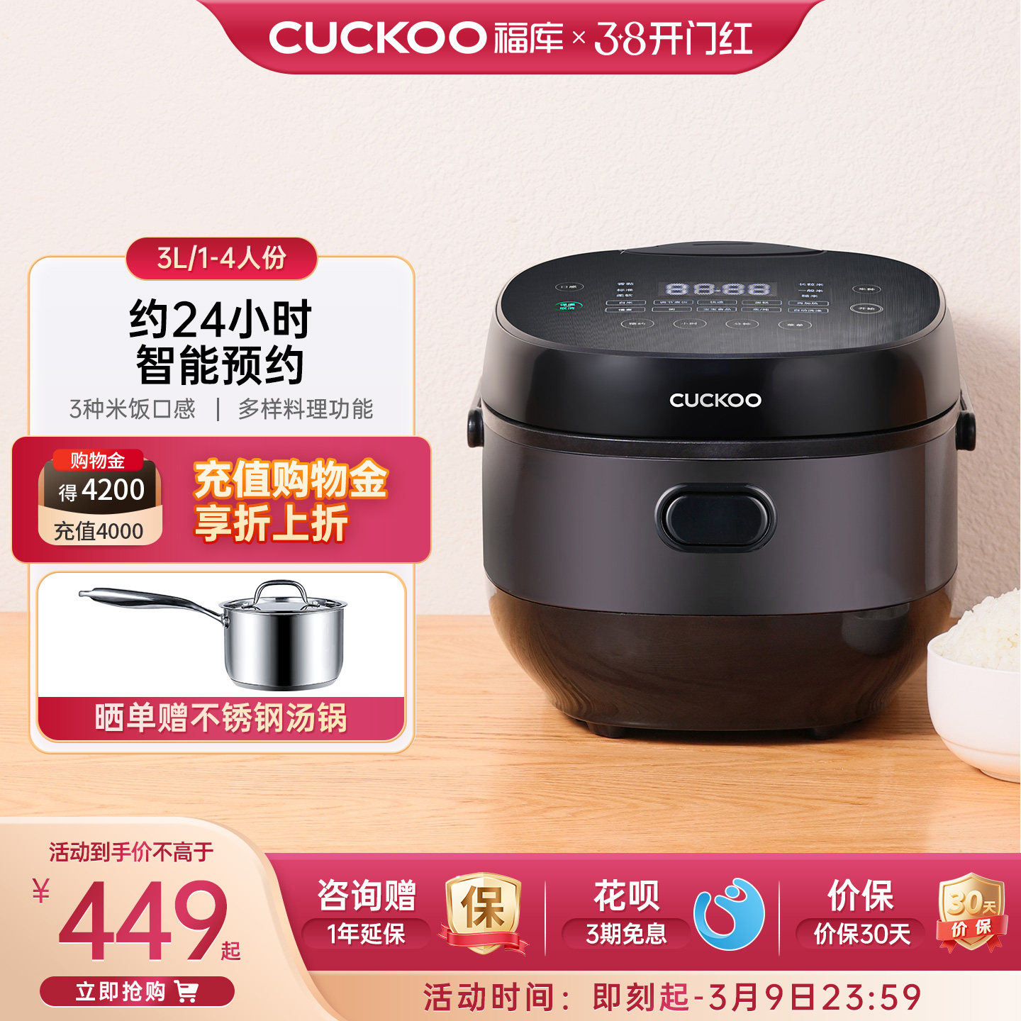 CUCKOO福库多功能电饭煲3L家用智能预约小型电饭锅1-4人