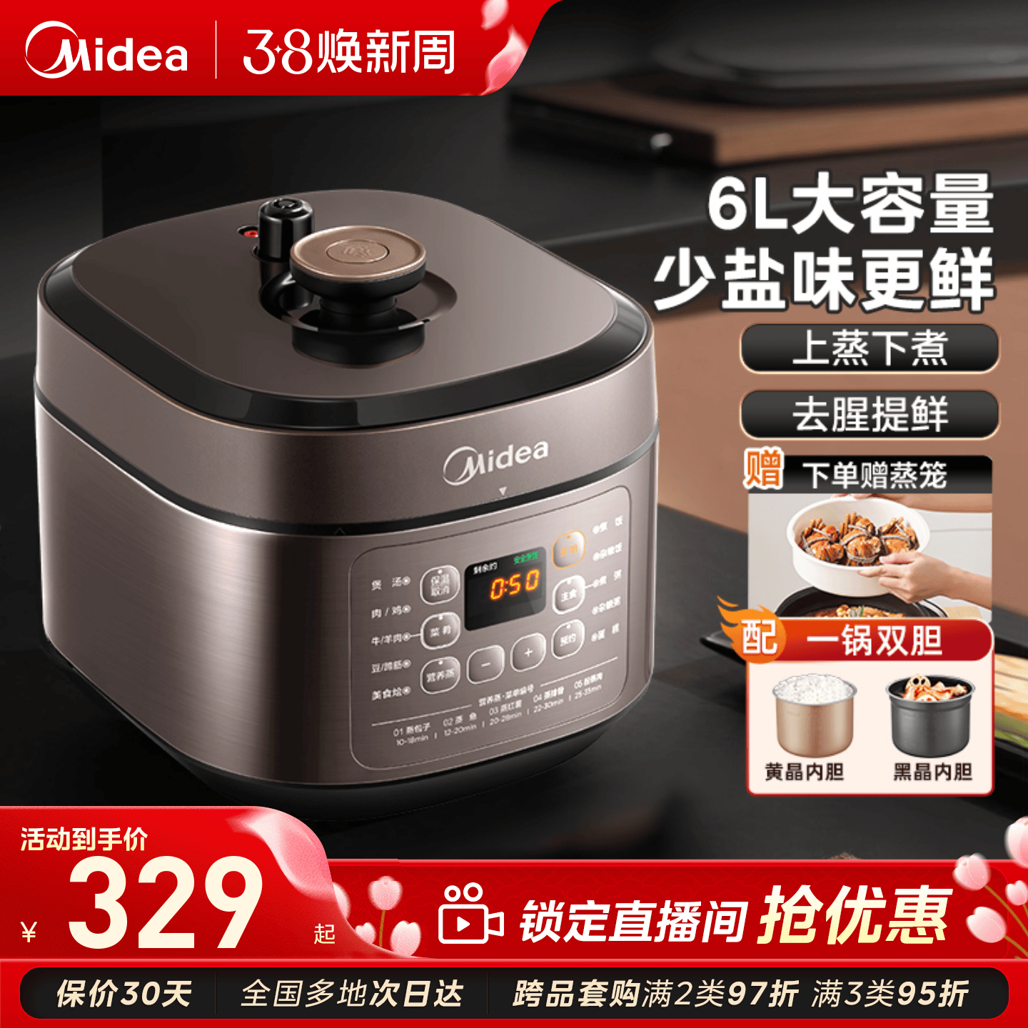 美的6L电压力锅家用2025新款蒸煮炖多功能电饭煲双胆压力锅二合一