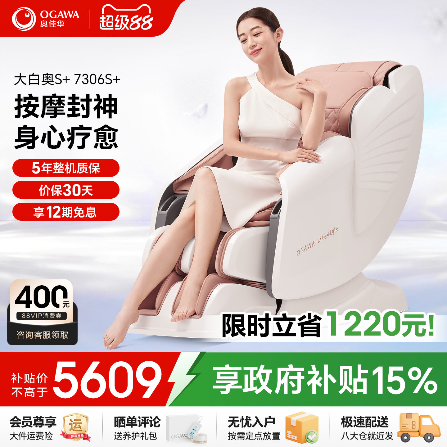 奥佳华按摩椅家用全身小型太空舱全自动多功能按摩沙发椅7306S+