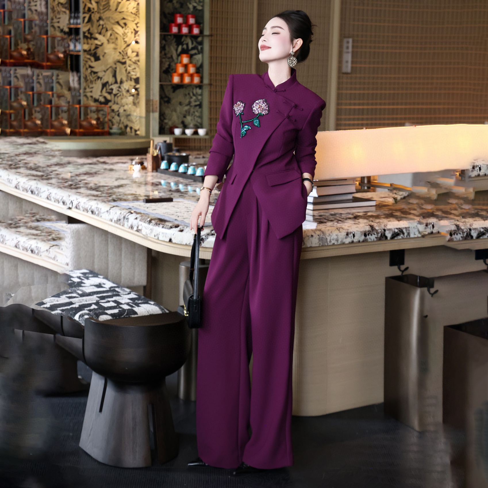 新中式国风职业套装女秋季新款重工刺绣立领盘扣外套阔腿裤两件套