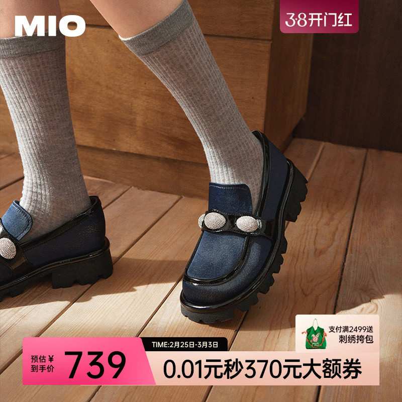MIO米奥乐福鞋女英伦学院风新款厚底单鞋复古圆头水钻千金小皮鞋