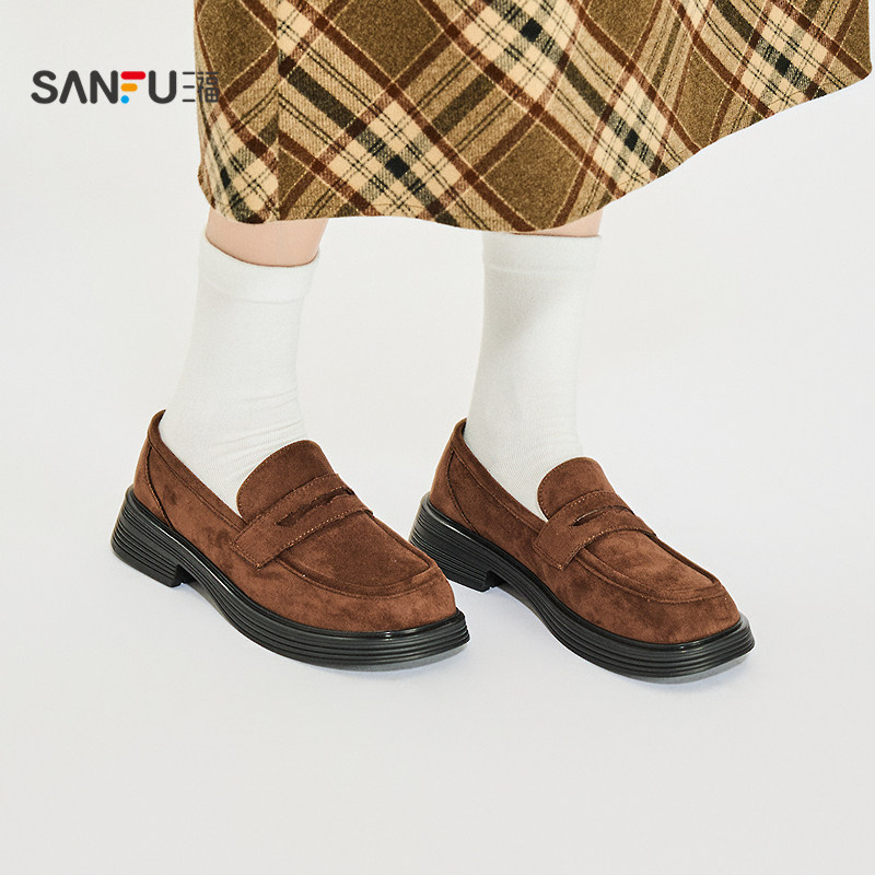 三福女乐福鞋秋季智性学院英伦复古风纯色圆头休闲女鞋848381
