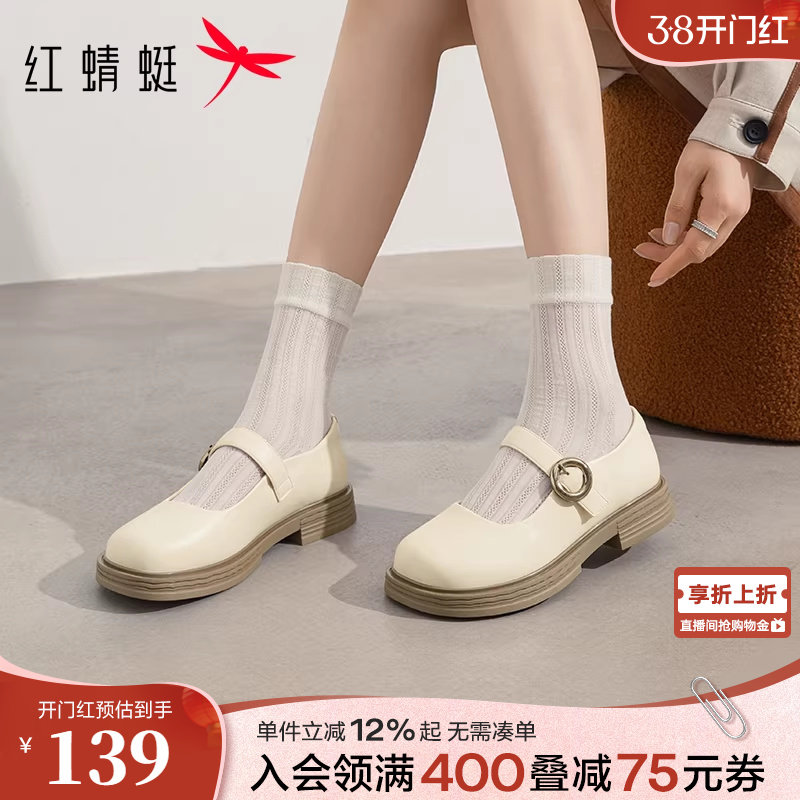 红蜻蜓玛丽珍鞋春季女鞋厚底学院风小皮鞋英伦风复古通勤白色单鞋