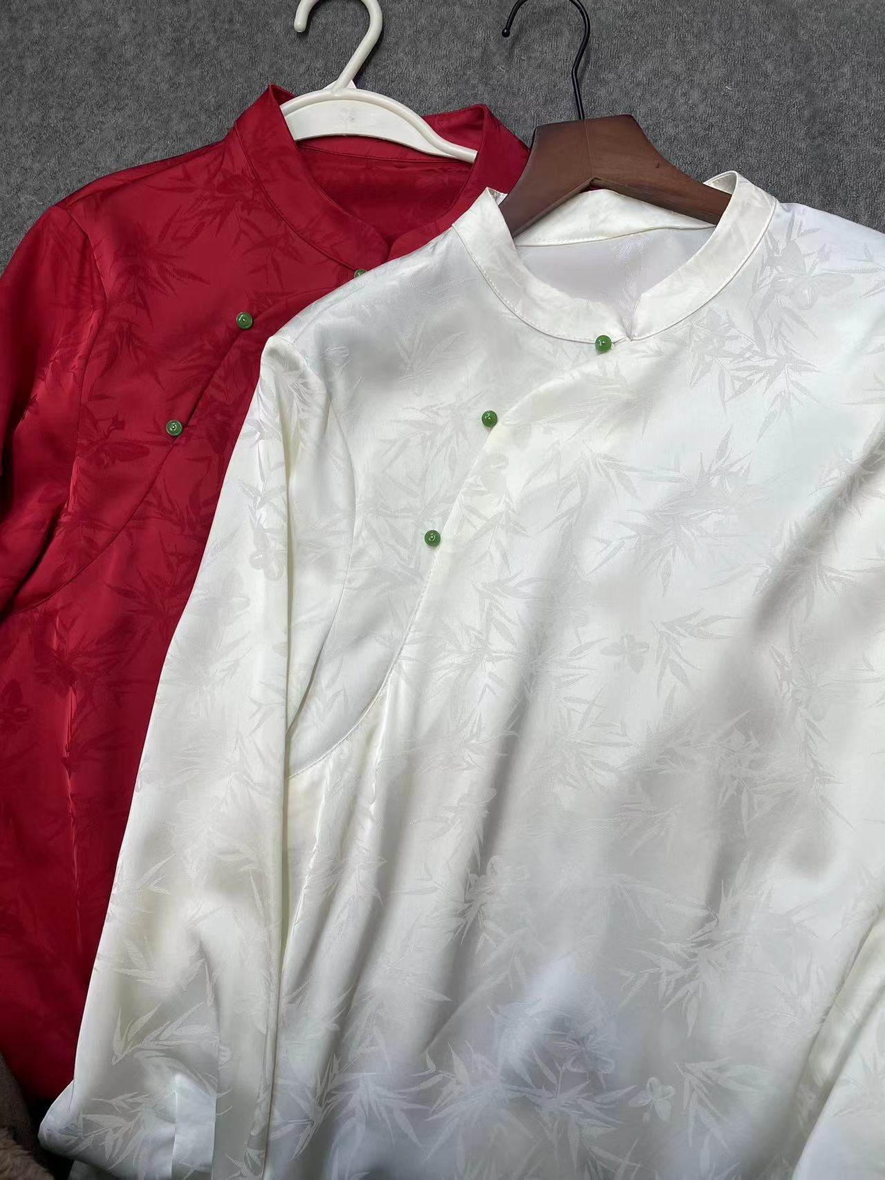 国风雅韵重磅24姆米真丝衬衫女70桑蚕丝交织提花缎立领长袖上衣春