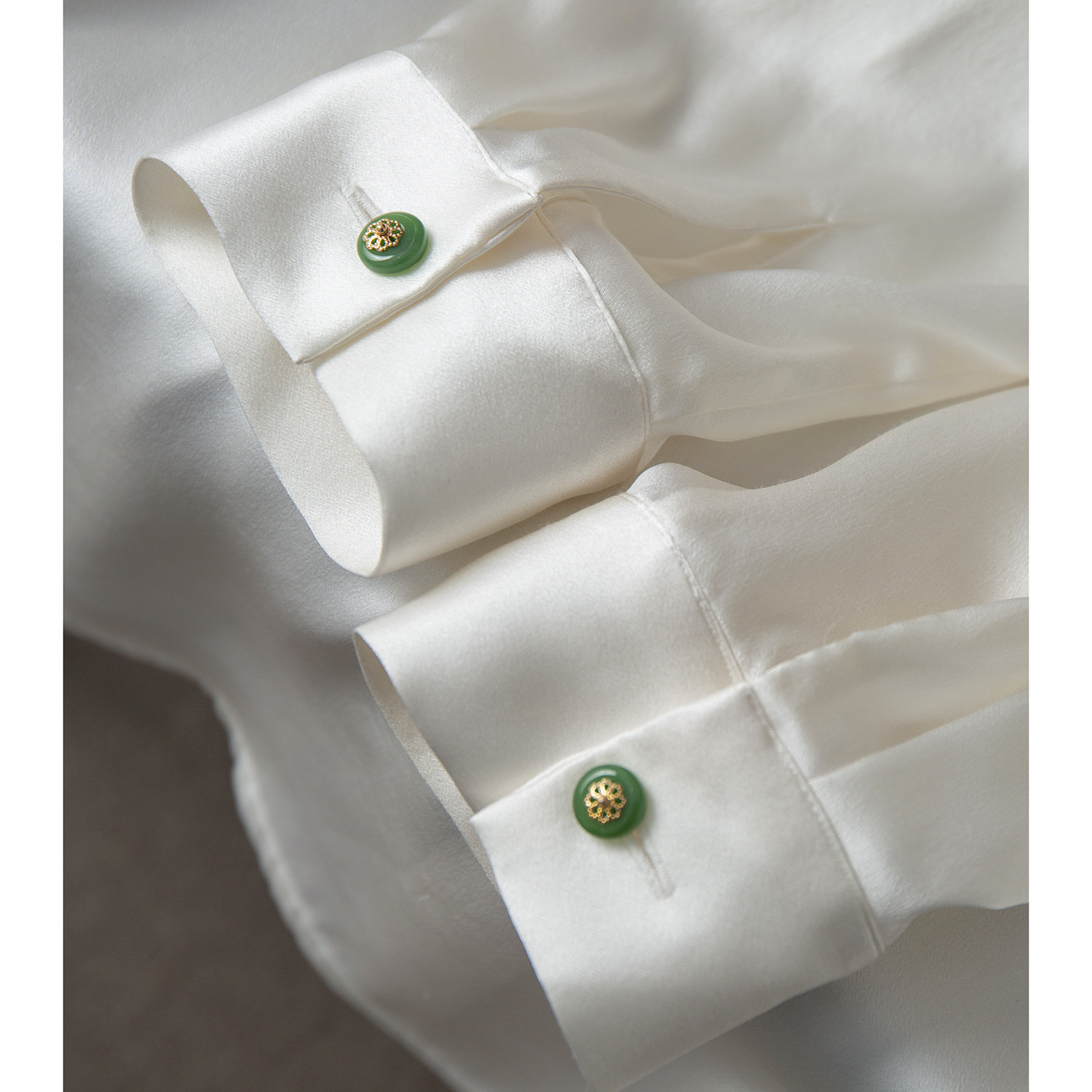 丝艺 100%桑蚕丝缎面立领真丝长袖白色衬衫女素绉缎衬衣早秋上衣