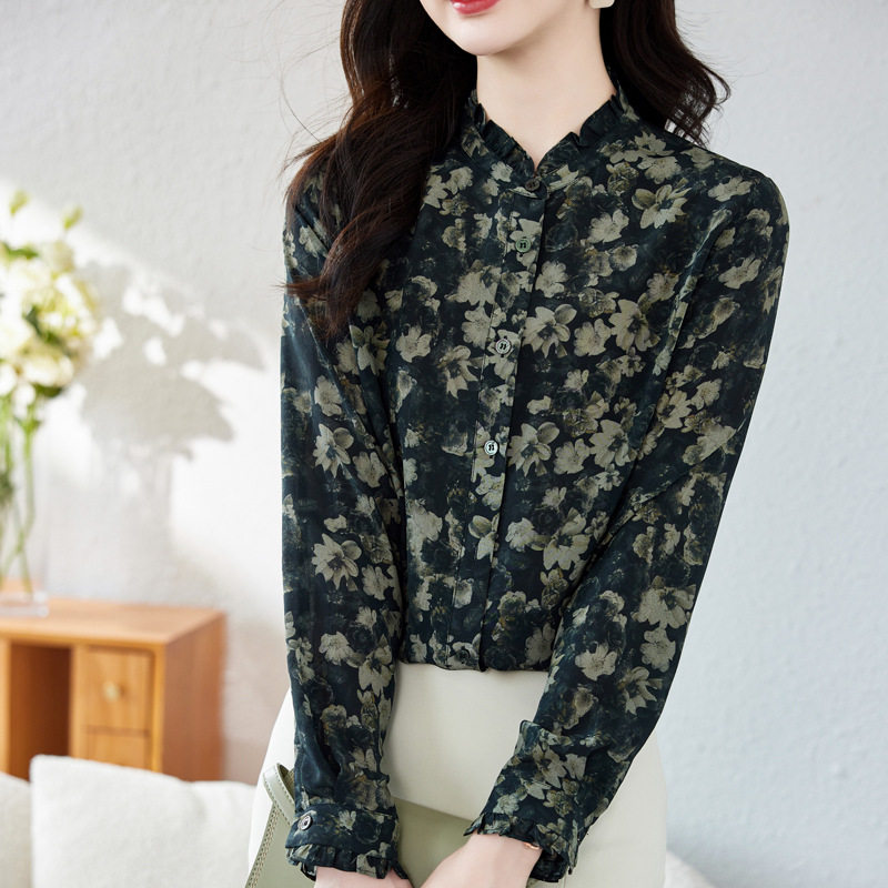 真丝长袖衬衫女春夏新品半高领直筒印花上衣桑蚕丝木耳边立领衬衣