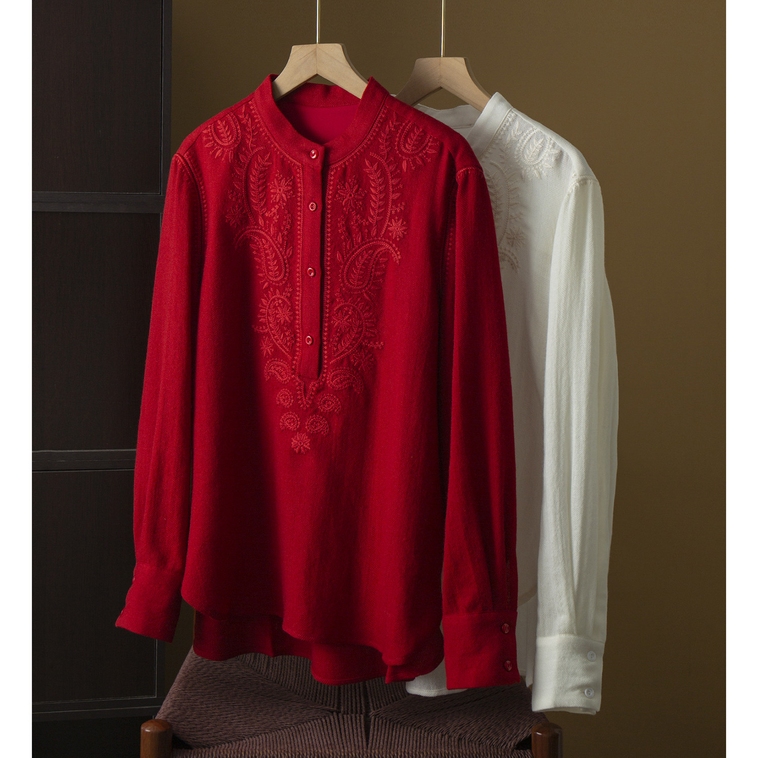 丝艺原创100%桑蚕丝底布下摆精致刺绣丝绒立领灯笼袖长袖真丝衬衫