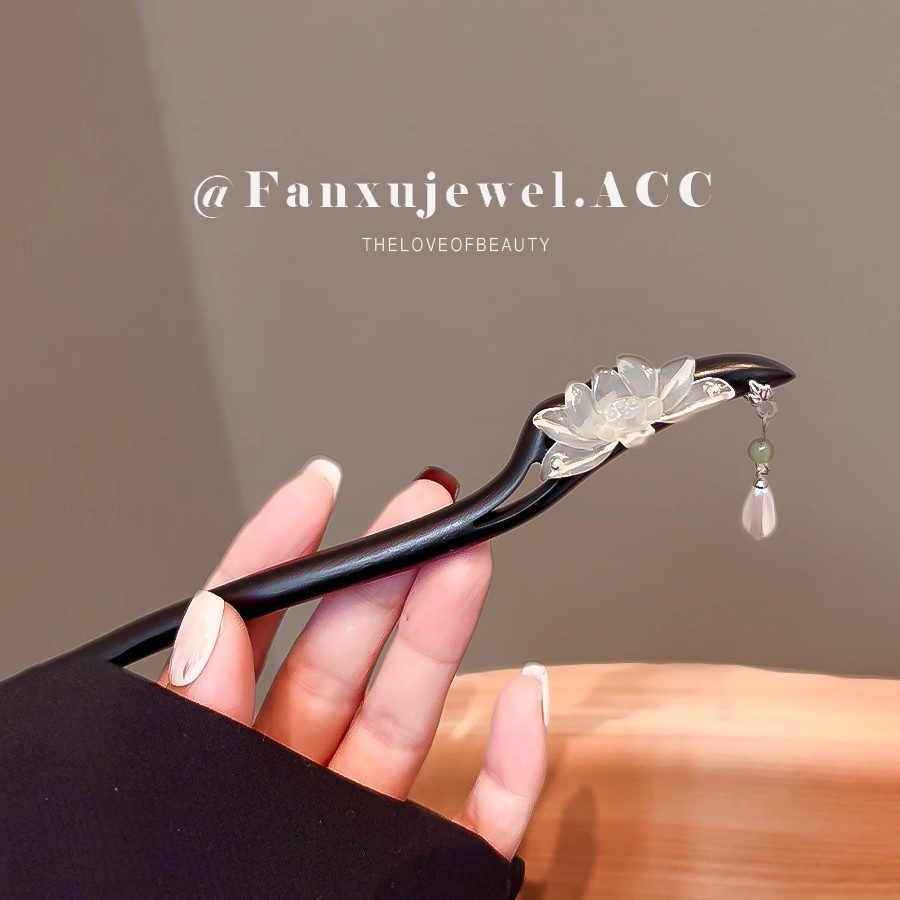 新中式莲花流苏檀木发簪女高级感发钗后脑勺盘发簪子汉服头饰双面