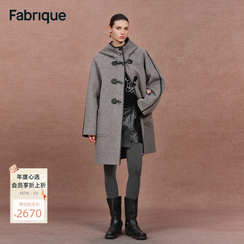 Fabrique烟灰羊毛贝壳刺绣牛角扣连帽毛呢中长大衣2025年冬季穿搭