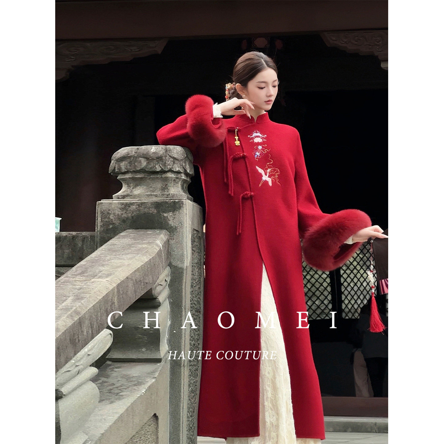 冯(CHAOMEI 【国色芳华】新中式羊毛大衣毛呢双面穿红色刺绣外套