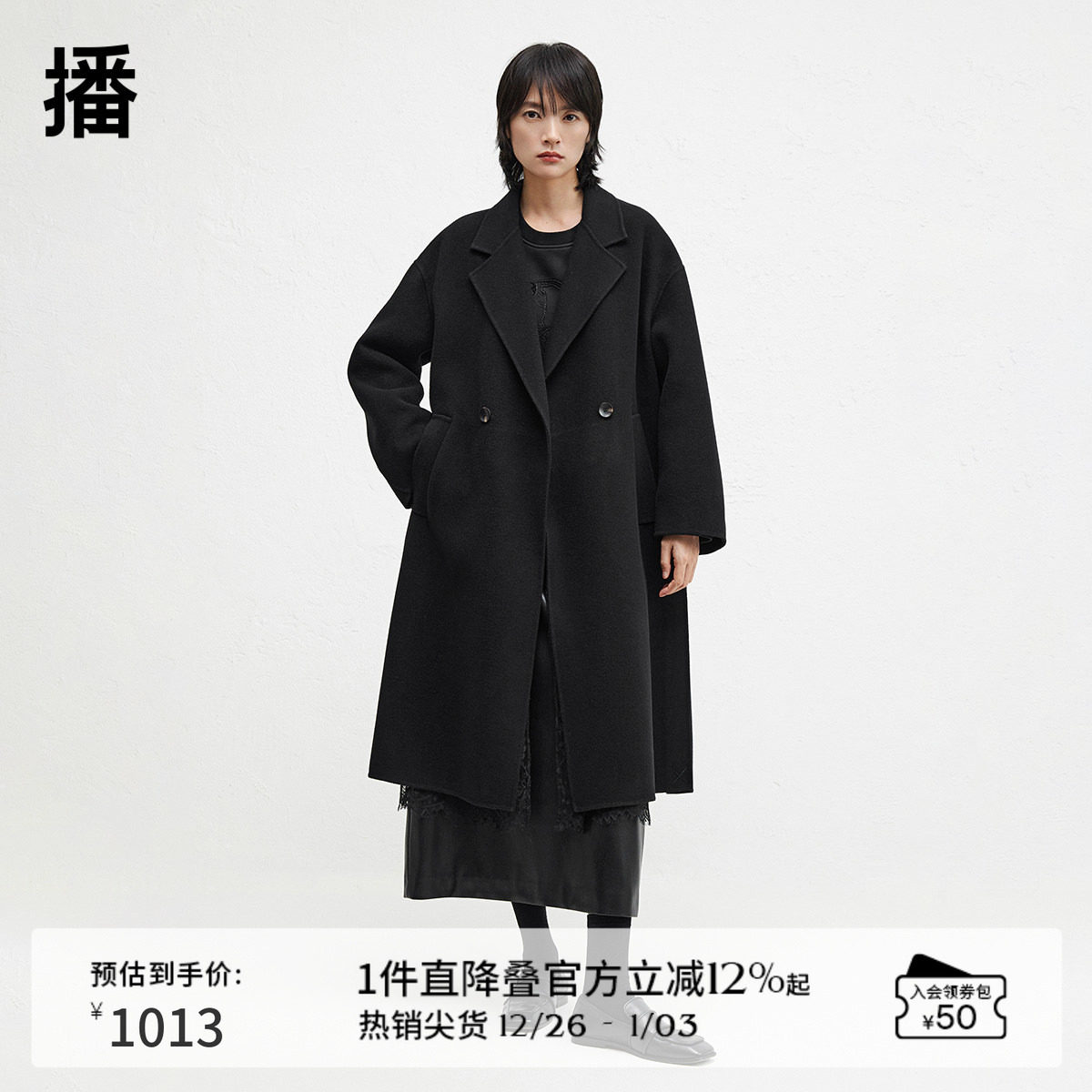 郁香菲双面呢羊毛大衣女中长款气质通勤冬季时尚刺绣系带毛呢外套