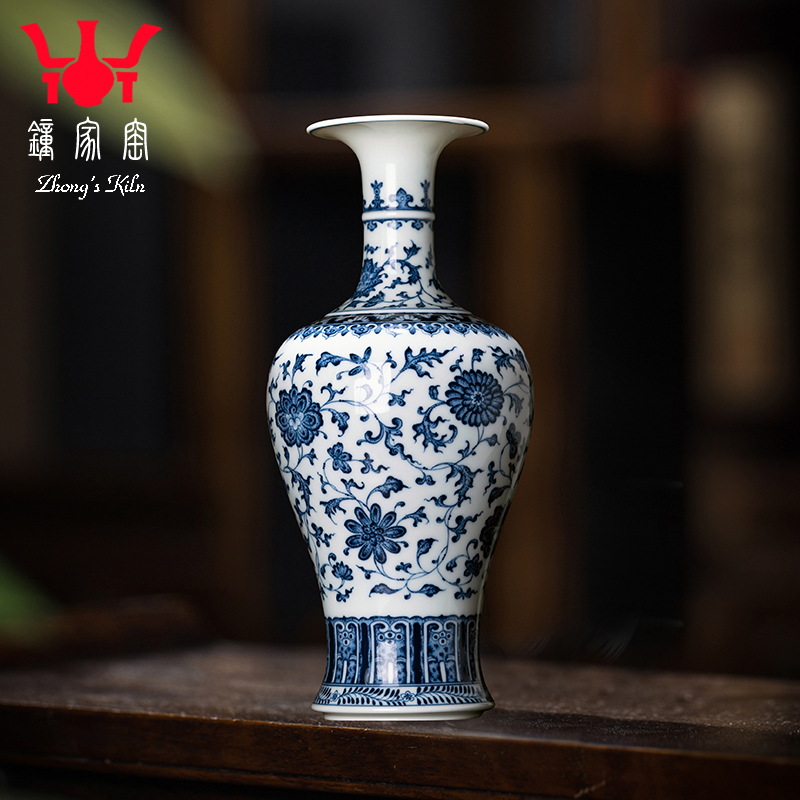 正品钟家窑小号陶瓷花瓶景德镇柴窑青花手绘缠枝花纹桌面小花插茶