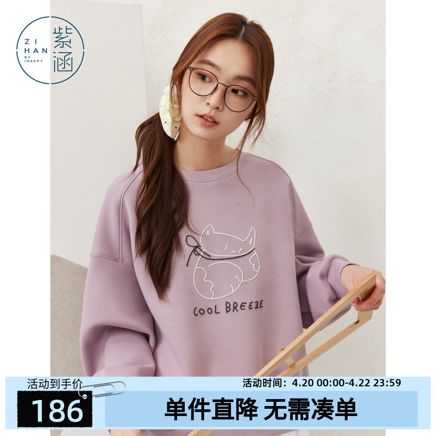 紫涵短款紫色圆领长袖卫衣女士秋季新款猫咪刺绣宽松显瘦套头上衣