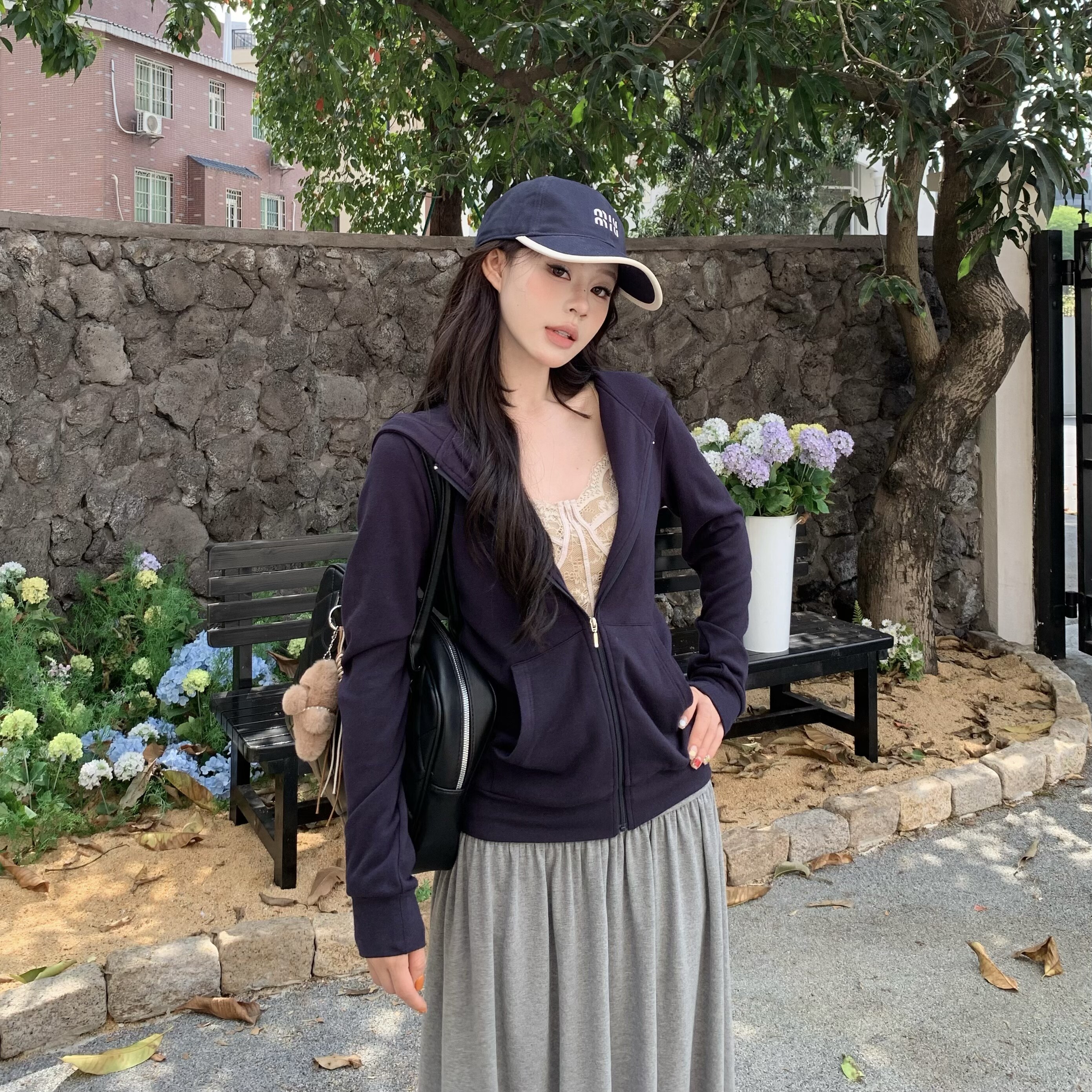 紫涵连帽灰色卫衣外套女士秋季新款户外休闲绣花宽松显瘦拉链开衫