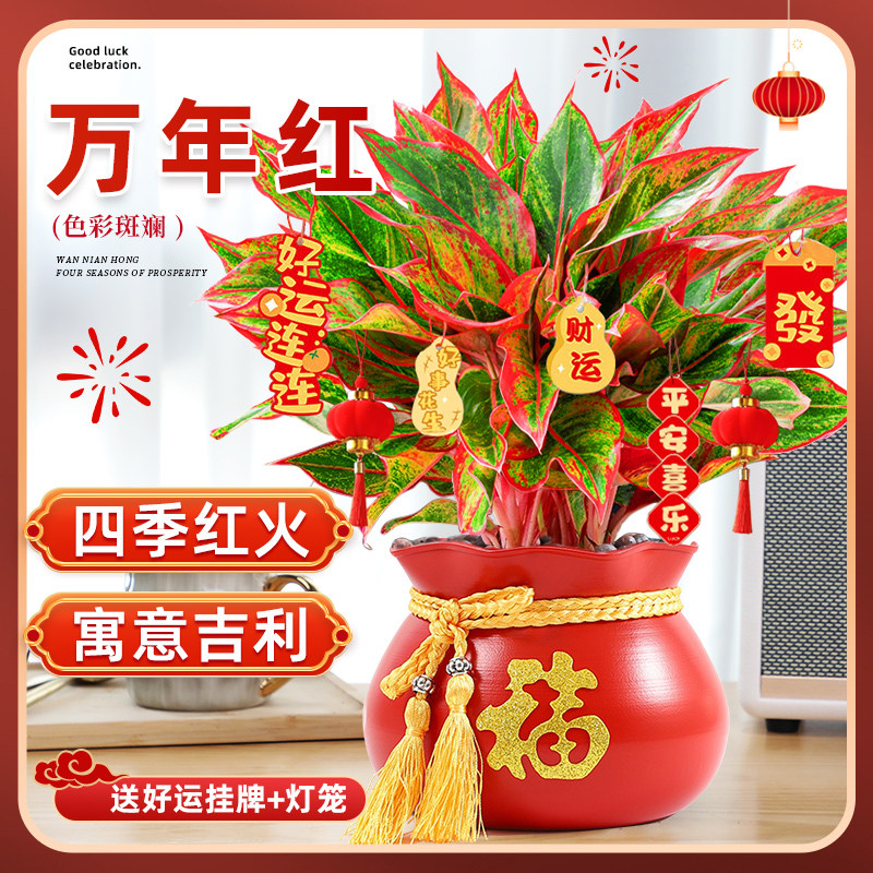 招财摆件吉利红带盆水培植物大红色中国红如意皇後小苗办公室桌面