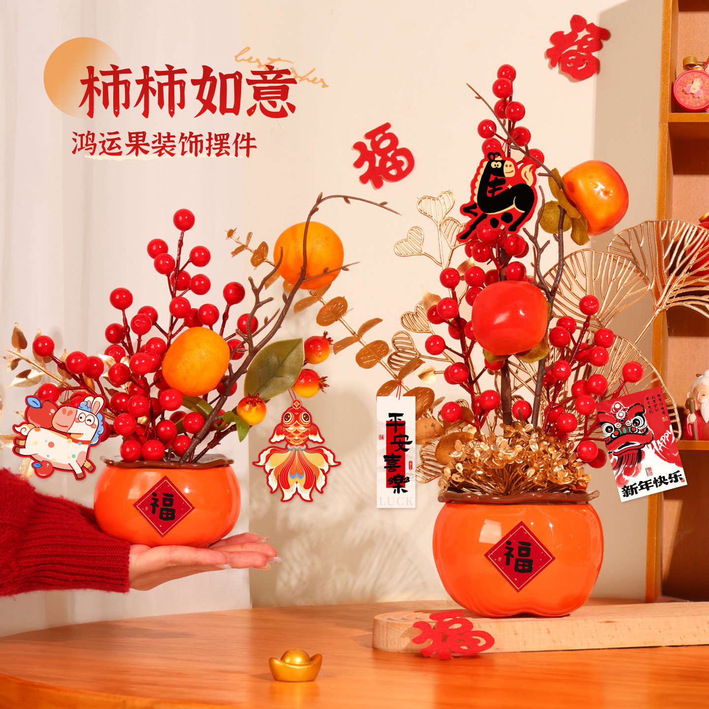 新年装饰柿子桌面摆件事事如意2026春节福桶客厅过年氛围布置年味