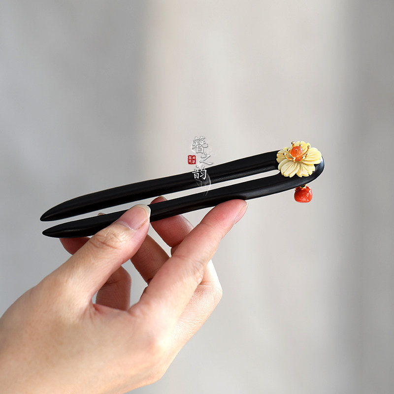簪之韵[好柿将至]深海黄碟贝花柿柿如意发饰盘发簪子U型双钗檀木