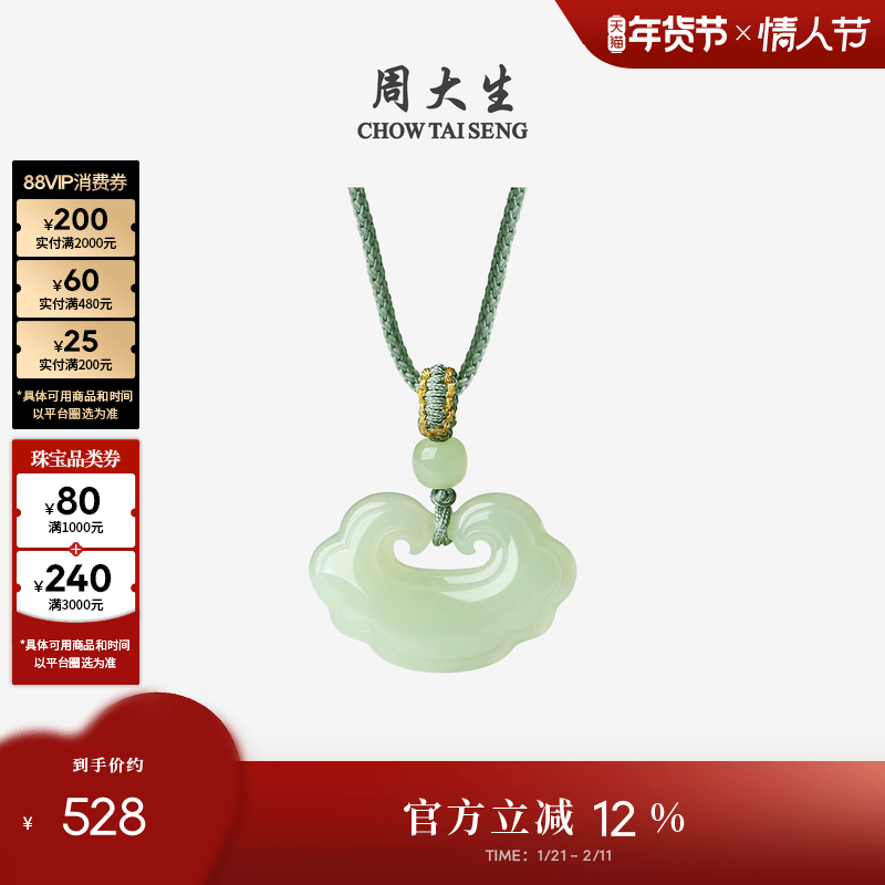 周大生和田玉吊坠女款如意平安锁玉挂坠项链编绳新年礼物送男女友
