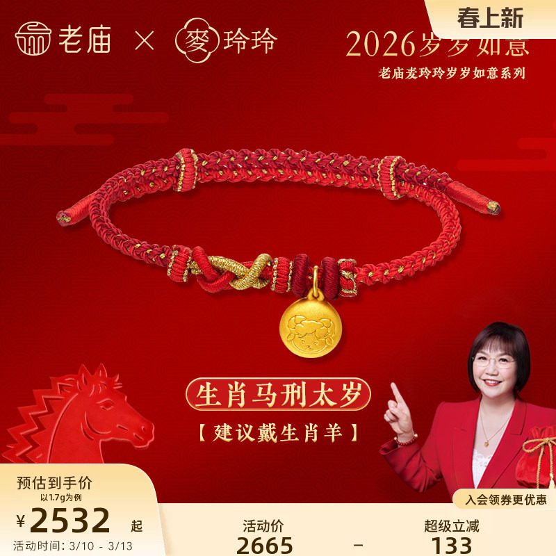 老庙黄金足金麦玲玲马年岁岁如意生肖小金豆红手绳5D小胖福礼物