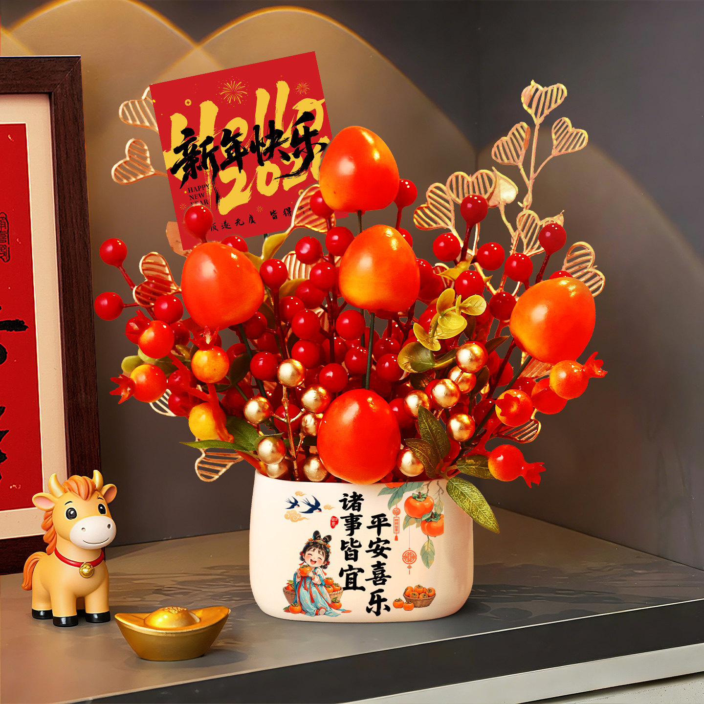 2026年马年装饰摆件新年过年春节柿柿如意福桶桌面新春小柿子摆台