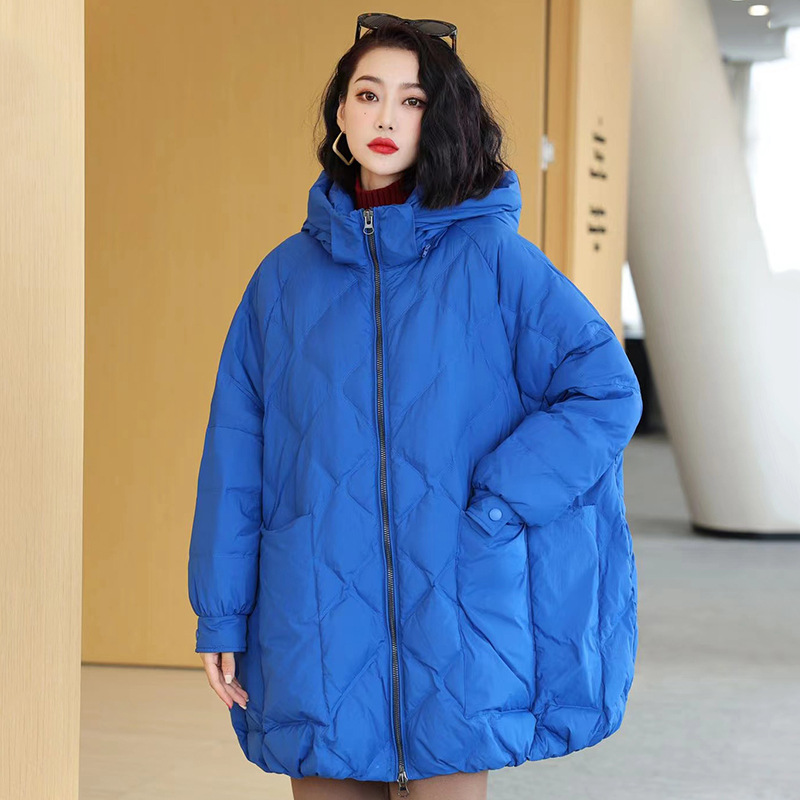 大口袋羽绒服女款2023年新款连帽宽松中长款菱形格白鸭绒胖mm大码
