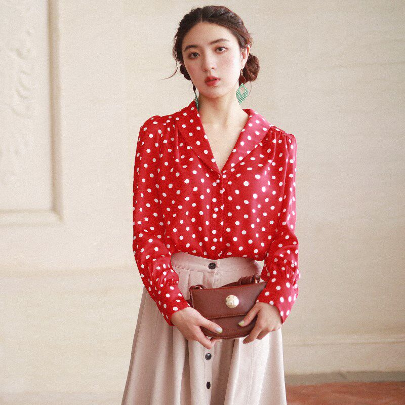 春季款红色长袖衬衫法式宽松衬衣复古港风上衣白波点雪纺衫气质女