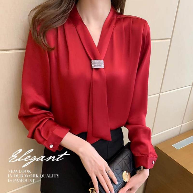 醋酸雪纺红色翻领衬衫女法式衬衫网红长袖OL上衣气质高级感衬衣潮