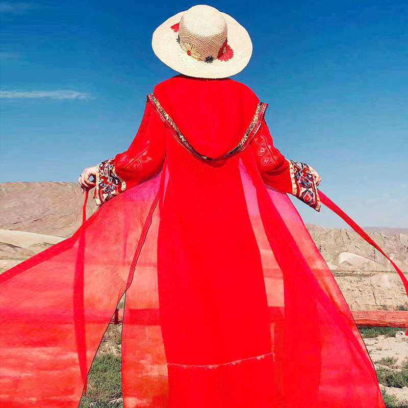 西藏沙漠旅游新款红色民族风披肩开衫女防晒外套雪纺长袖沙滩上衣