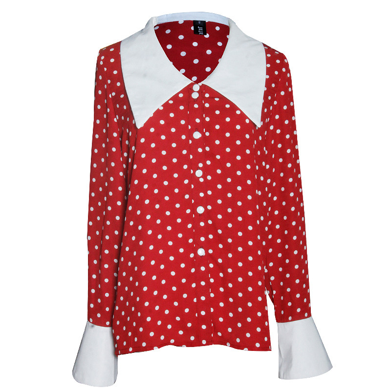 春秋季红色长袖衬衫法式复古港风宽松上衣白波点雪纺衫气质女休闲