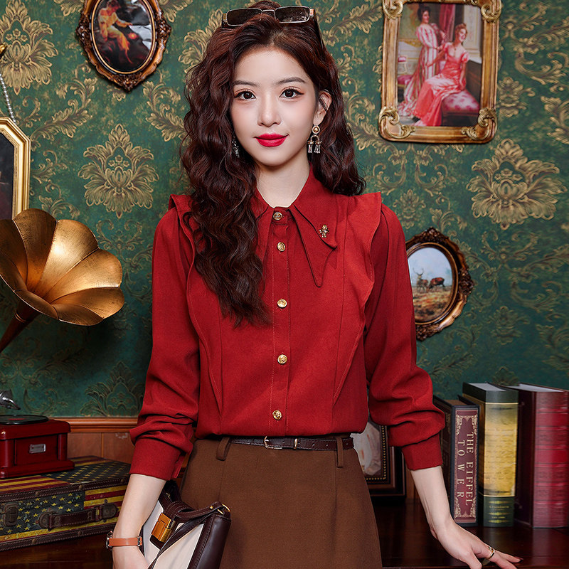 醋酸雪纺红色翻领衬衫女法式衬衫长袖OL上衣气质高级感欧货衬衣潮