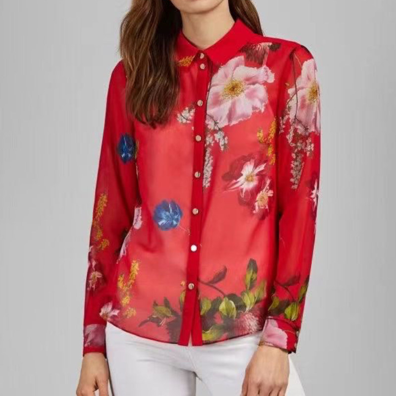 高端红色印花雪纺衬衫女长袖复古别致外穿衬衣2024春秋季新款上衣