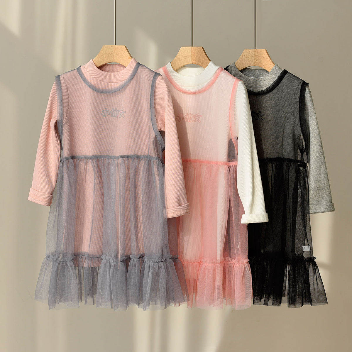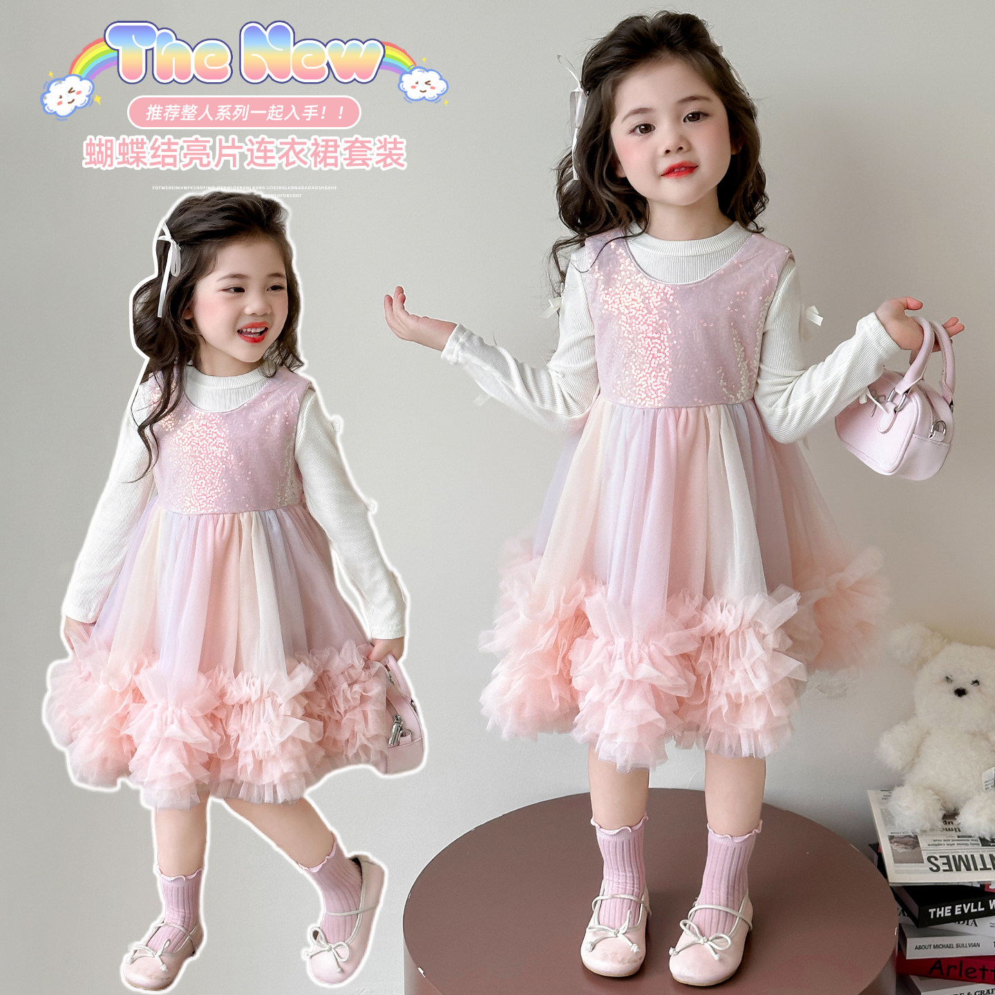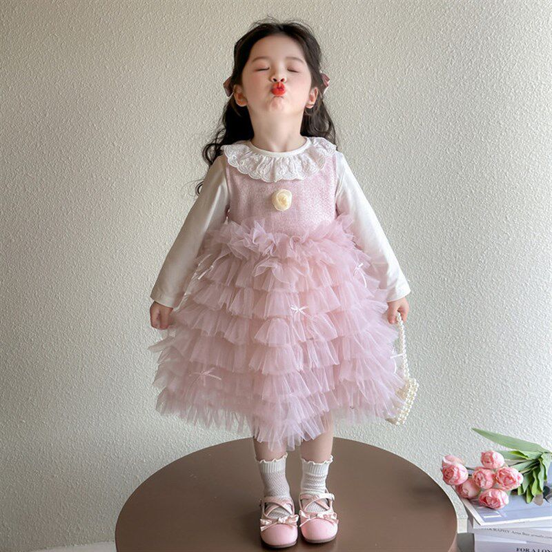 女童蛋糕连衣裙套装2026新中小童甜美打底衫两件套宝宝洋气网纱裙