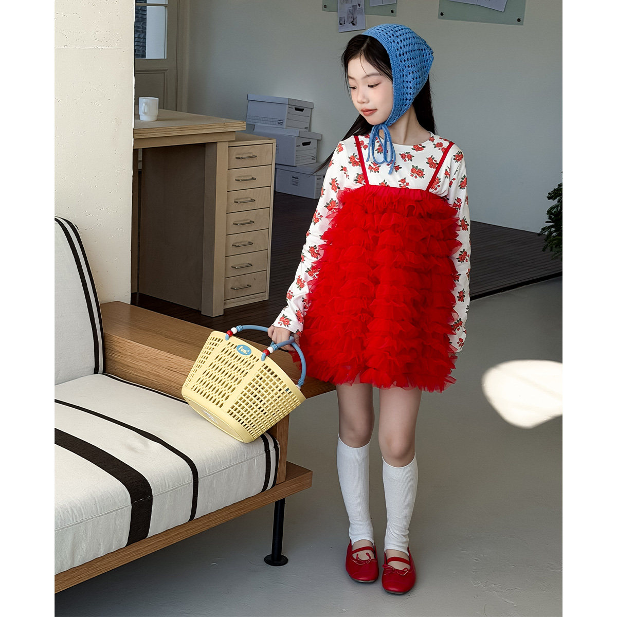 15.小鸡家原创‘莲红‘色织金粉立体花马甲两件套儿童连衣裙纱裙