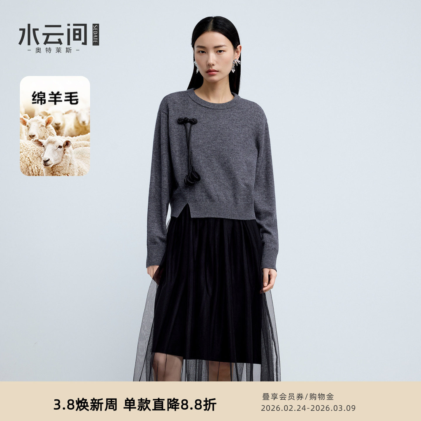 水云间灰色羊毛针织衫毛衣连衣裙女国风黑色纱裙两件套2026春新款