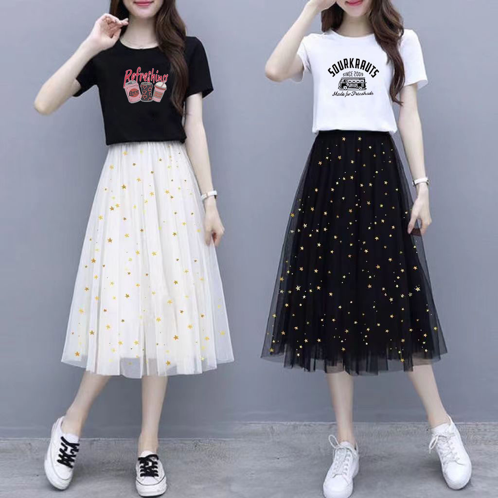 小个子连衣裙套装女2026夏季新款a字半身裙短袖T恤网纱裙女两件套