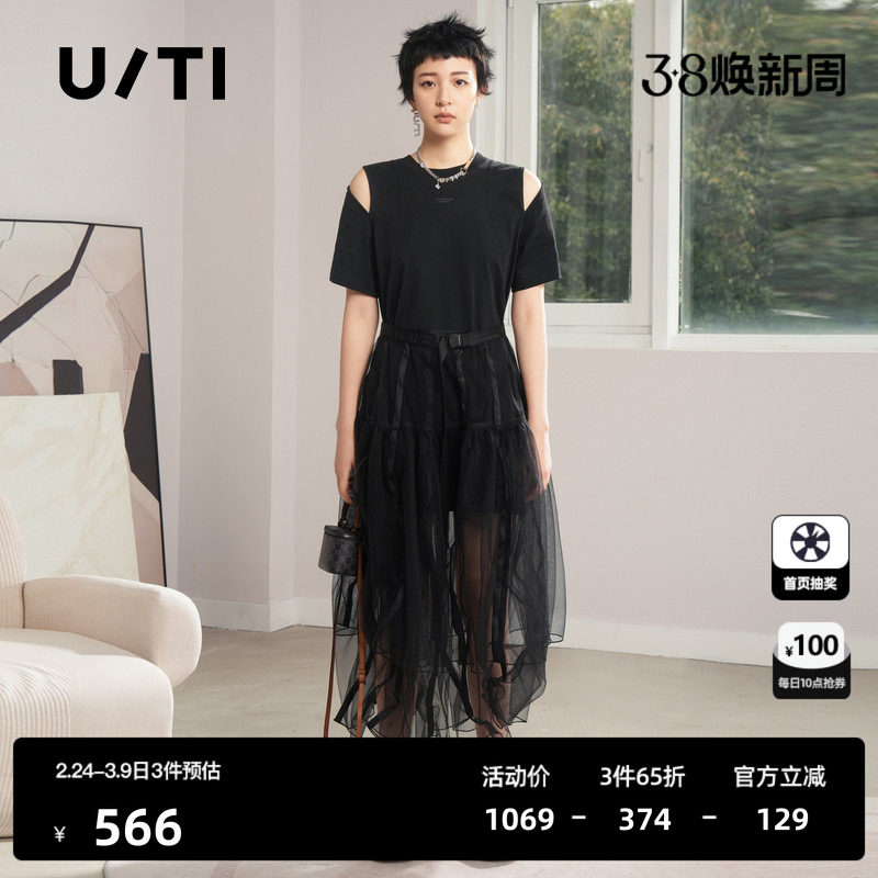 U/TI黑色两件套T恤网纱裙女 时尚百搭重工连衣裙尤缇时尚秋季新款