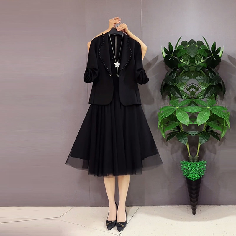 加肥翻领长袖西服外套网纱裙摆连衣裙胖MM气质黑色通勤显瘦两件套
